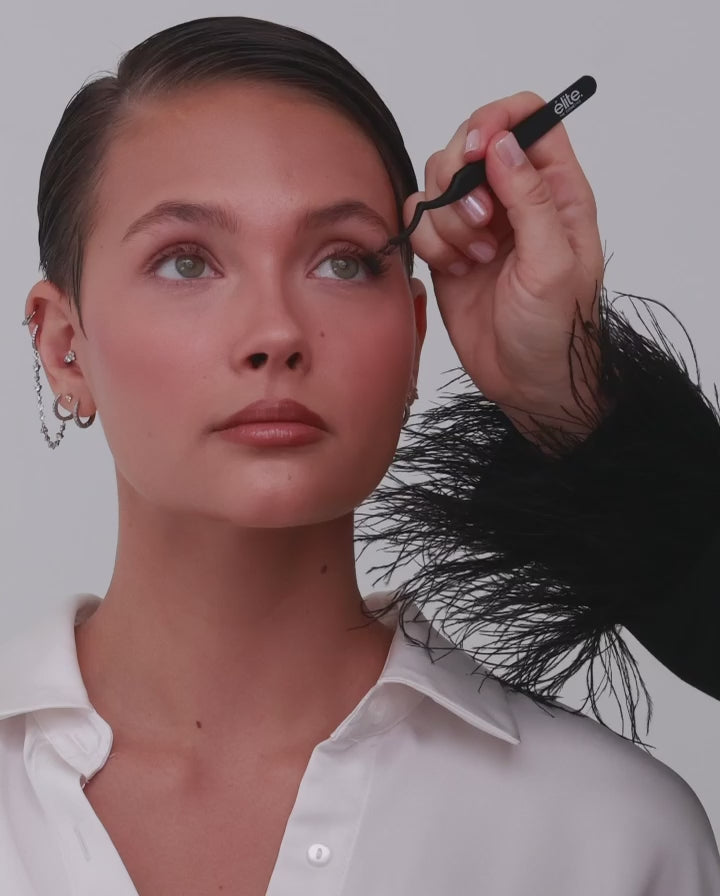 Mit dem Elite-Tweezer die Lash-Segmente aufnehmen und einzeln entlang der Wasserlinie anbringen. Lass 1–2 mm Abstand für ein angenehmeres Tragegefühl.
